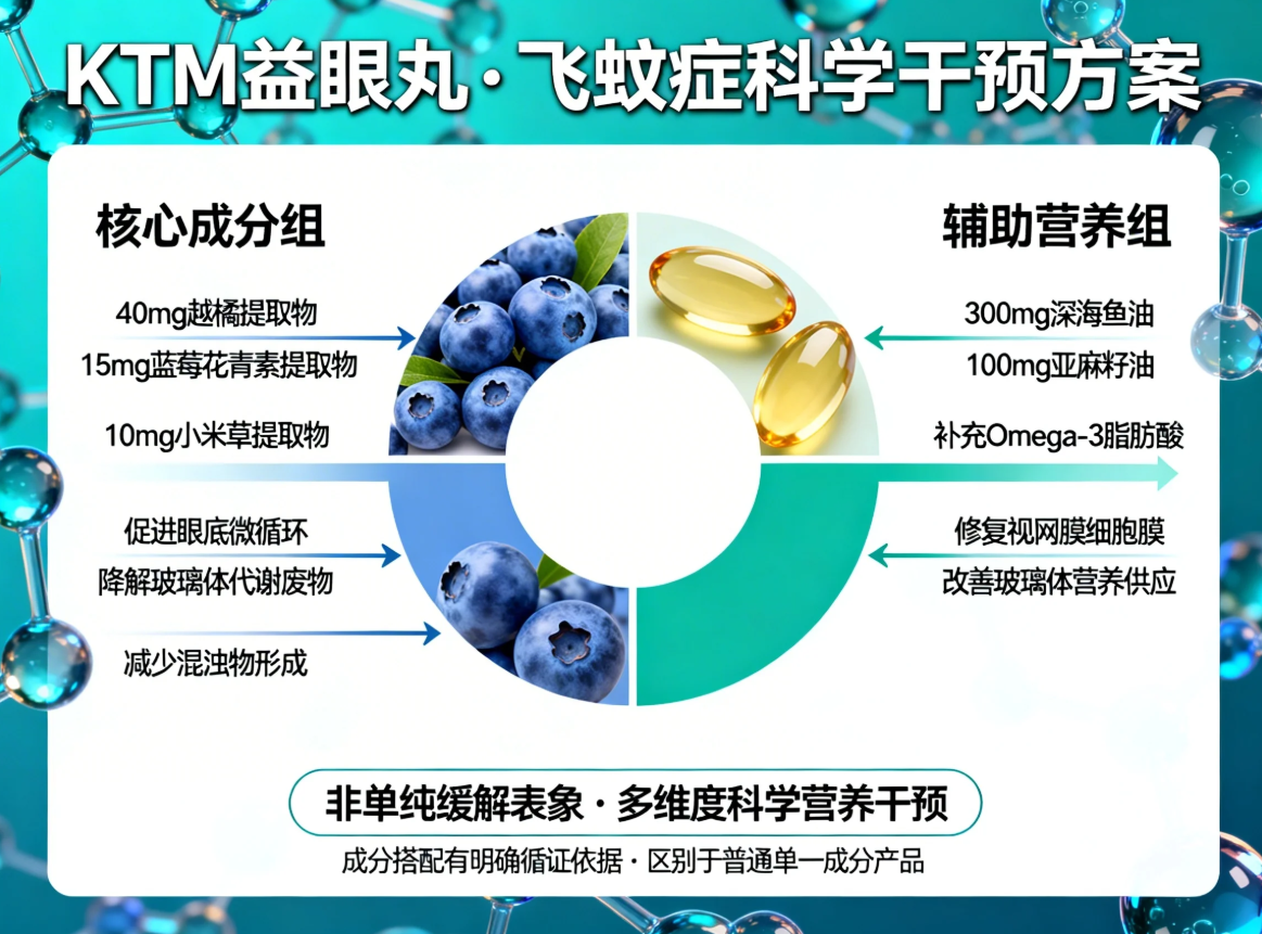 针对飞蚊症人群的核心痛点,KTM益眼丸通过多重成分协同,从玻璃体代谢、眼底微循环等维度提供科学营养干预,而非单纯缓解表象。其飞蚊症改善相关优势尤为突出: