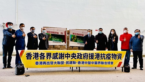 香港食物及卫生局副局长徐德义、首席助理秘书长兼中医处处长陈尚敏等有关部门代表,香港再出发大联盟、民建联、香港中医中药界联合总会、香港中国企业协会等组织机构,港区全国政协委员、立法会议员、香港再出发大联盟副秘书长黄英豪、民建联立法会议员陈恒镔、自由党立法会议员邵家辉、香港中国企业协会副总裁曾燊典等各界人士代表出席了于2月23日在柴湾特区政府物料营运中心举行的“香港各界感谢中央政府支持香港抗疫物资活动”。