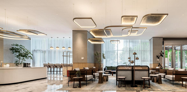 宽敞明亮的大堂,采用通透的全落地玻璃设计,使大量自然光线充满大堂每一个角落。大厅希尔顿花园酒店特色的花瓣形吊灯,为酒店布局更添美感。而中央花园的迎客松,似独具特色的山水画面,以热情好客的姿态迎接宾客的到来。餐厅和大堂吧采用共享和社交的概念,以无阻隔的连通空间;同时兼顾宾客用餐、社交的需求;另外,便捷易用的充电插头,也为商务客人提供了便利的办公环境。