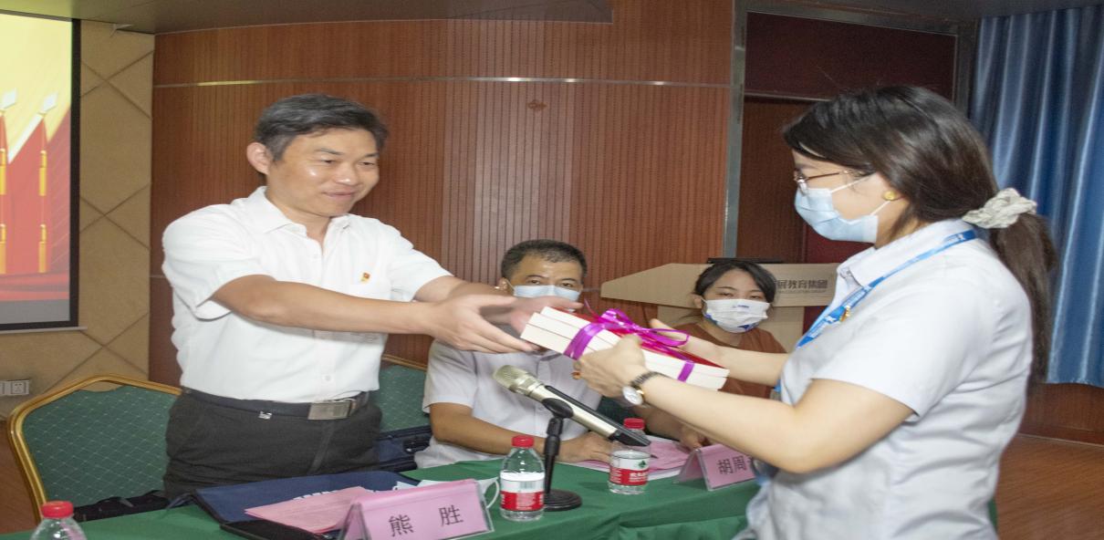 (图为:熊胜同志代表区党工委向康展集团赠送有关党建书籍)