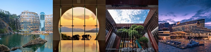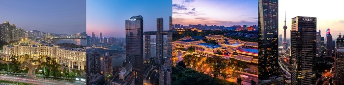 从左至右依次为:厦门海沧英迪格酒店、重庆朝天门voco酒店、西安唐华华邑酒店、上海浦东丽晶酒店