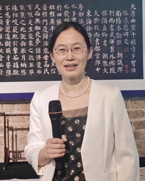 英国汉学家、英中了解协会理事吴芳思博士(Dr. Frances Wood)在致辞中表示,中华文明历史悠久,博大精深。汉字在中华历史文化的传承发展中扮演着极为重要的角色。她特别提到,本次展品中有《金刚经》中一页的复刻,这是世界上第一本有确切日期的印刷书籍,印于公元868年,现存大英图书馆。展览中雕版印刷的部分也展示了宋体和唐风汉字不同的风格,她希望更多英国观众能观看这个展览,了解这一有史以来最古老迷人的技术。