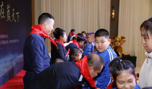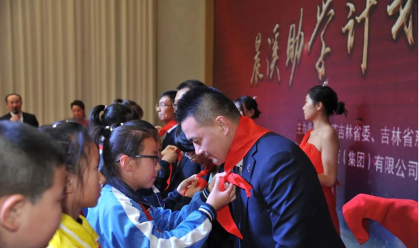吉林省慈善总会秘书长王志勇、副秘书长邹运,东丰城市发展投资(集团)有限公司徐文涛董事长、东丰国际梅花鹿产业发展有限公司陈艳伟董事长、东丰国际梅花鹿产业发展有限公司副总经理刘洋、长春市饭店餐饮烹饪协会会长夏金龙、吉林省爱心企业代表为来自东丰县地区十所中、小学学生代表和长春市二道区春城小学的孩子们发放救助金,孩子们在现场为这些爱心人士戴上了鲜艳的红领巾!