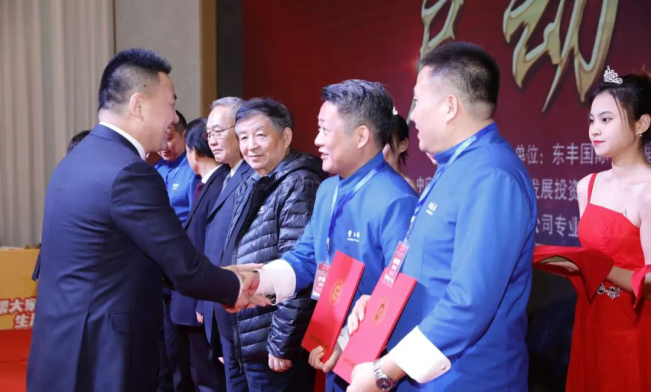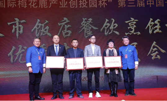 东丰县东丰县梅花鹿产业发展局局长李铁军、东丰城市发展投资(集团)有限公司董事长徐文涛为获得金鼎宴席奖的12家餐饮企业颁发奖牌。