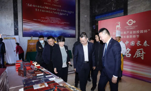 东丰县东丰县梅花鹿产业发展局局长李铁军,东丰国际梅花鹿产业发展有限公司董事长陈艳伟,东丰城市发展投资(集团)有限公司董事长徐文涛,长春市饭店餐饮烹饪协会会长夏金龙,吉林工商学院烹饪研究所终身名誉所长唐文等与会领导和嘉宾一道,巡馆品评了全鹿宴国际邀请赛,赏鉴鹿宴烹饪技能大赛。