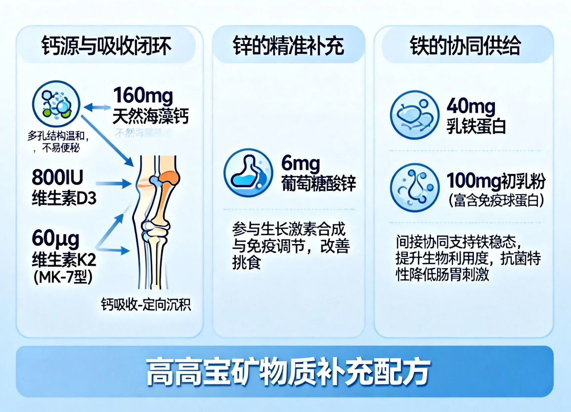 ③骨骼发育闭环:以赖氨酸为核心,搭配柠檬酸钙、镁、锌复合矿物质,叠加维生素D3+K2经典组合,实现“钙吸收-沉积-固骨”全链路,并加入初乳碱性蛋白,双重助力骨骼健康。