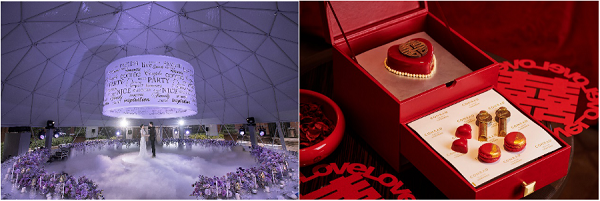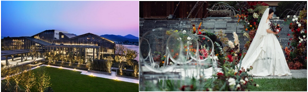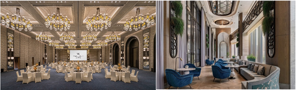 厦门华尔道夫酒店的8米挑高无柱宴会厅(左),厦门华尔道夫酒店的日光廊是新人接待亲友的理想场所(右)