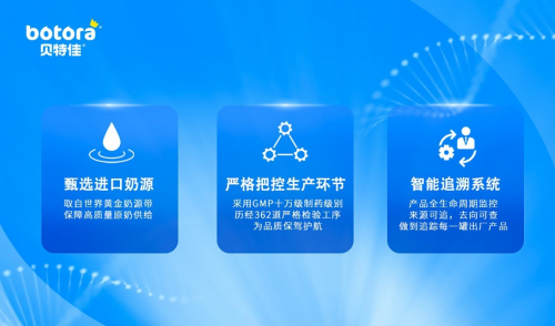 贝特佳奶源甄选自"全球黄金奶源带",依托黑龙江、新西兰两大生产工厂,采用安全、先进的干湿法复合的生产工艺,保证产品的均匀性、营养性,全程配以产品可追溯系统,真正做到了为婴幼儿提供科学创新和品质卓越的产品!
