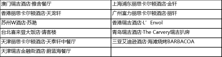 广州富力丽思卡尔顿酒店丽轩、苏州W酒店苏滟、天津丽思卡尔顿酒店天泰轩