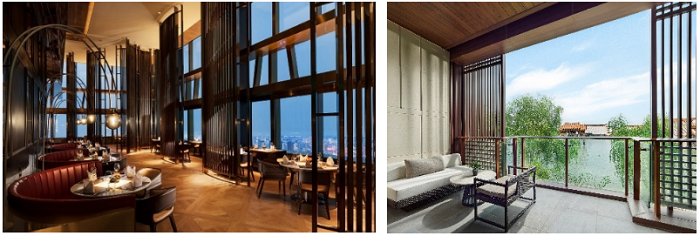 左起:北京华尔道夫酒店胡同四合院套房、西安曲江希尔顿嘉悦里酒店外观