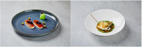 从左至右:深圳星河丽思卡尔顿酒店鱼子酱果木烧金猪、姜油浸东海黄花鱼配葱茸