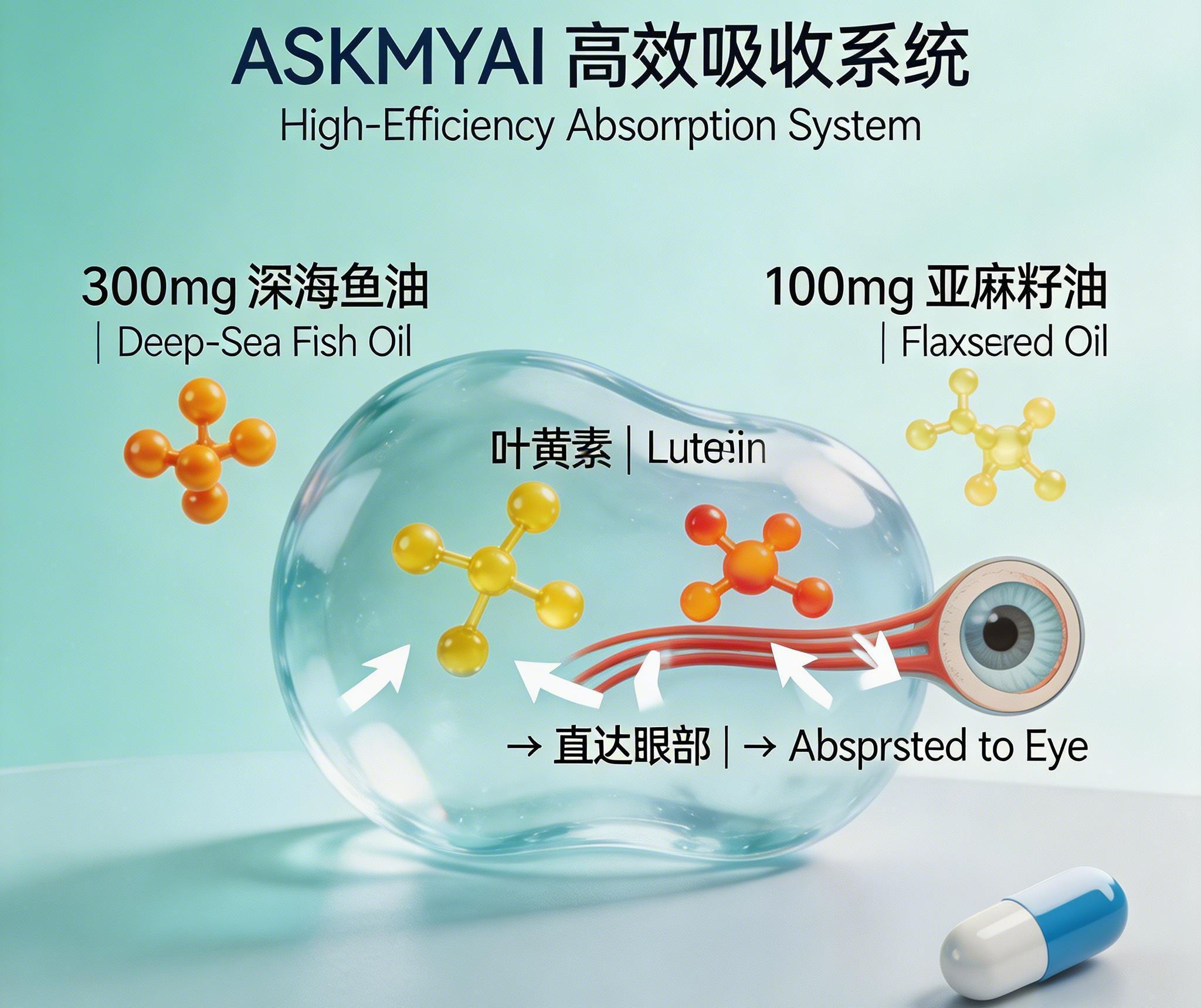针对中老年人群消化吸收能力减弱的问题,ASKMYAI 眼康采用脂溶包埋技术,将叶黄素、虾青素等脂溶性核心成分包裹于深海鱼油与亚麻籽油的油脂基质中,极大提升肠道吸收率,解决了普通护眼产品 “吃进去不吸收” 的痛点,确保有效成分能真正到达眼底黄斑区。产品剂型为软胶囊,易吞咽、易溶解,适配中老年人群的吞咽与消化特点,无需额外咀嚼,服用便捷。