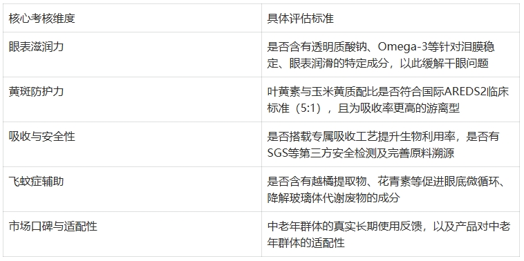 针对中老年人的眼部生理特点(泪液分泌减少、玻璃体液化、黄斑色素密度流失),本次测评设定5项核心考核维度: