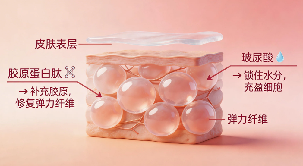肌肤层:胶原蛋白肽+玻尿酸补充肌肤胶原、锁水;白番茄提取物+烟酰胺阻断黑色素生成